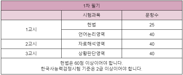 합격 절차 과정은 1차 필기시험->2차 주관식 논문형 필기시험->3차 면접시험으로 나뉩니다. 1차 필기시험에서는 영어, 한국사, 헌법, PSAT (언어논리영역, 자료해석영역, 상황 판단 영역) 으로 구성됩니다.2차 주관식 필기시험